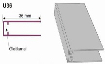 Typ U30 hat eine Breite von 30 mm, Typ U36 eine Breite von 36 mm. Typ U36 mit zusätzlichem Gleitkanal für Sonderformen. Ausführung natureloxiert in RAL- oder DB-Farben pulverbeschichtet.